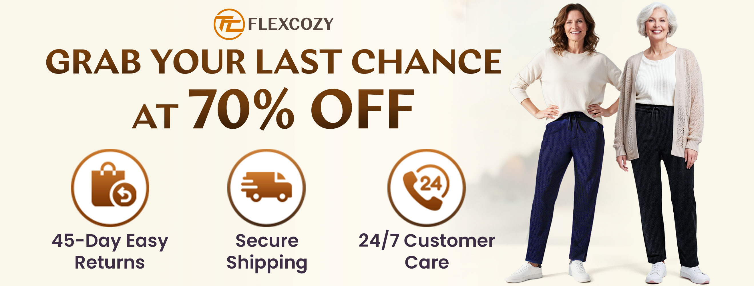 I'm so glad I found FlexCozy pants online! They’re super comfy, easy to put on, feel cozy all day, and look fantastic. They’re just as good as the expensive pants at department stores but cost less than half the price! I tell all my friends to grab a pair before they’re gone!
